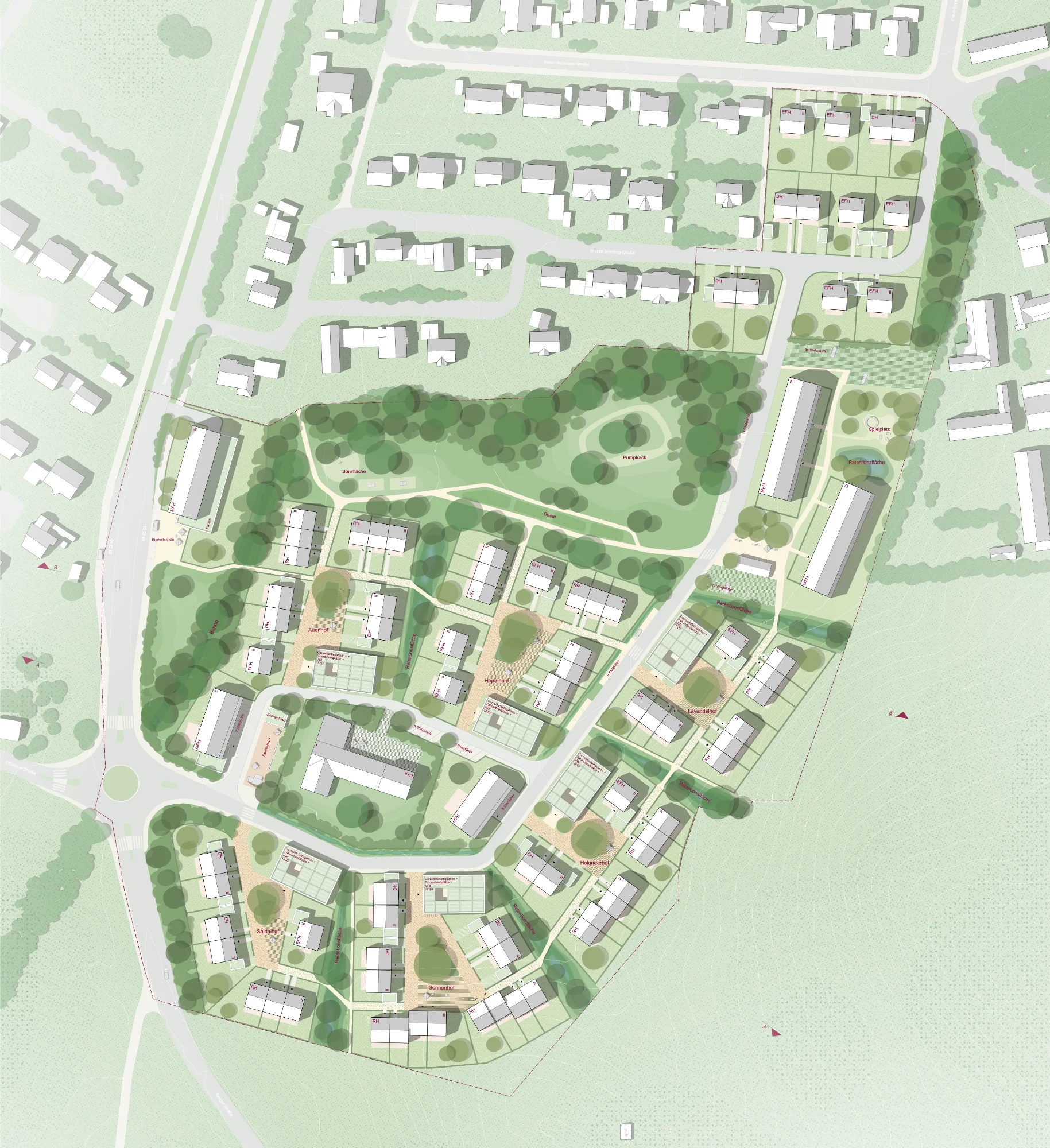 Am südlichen Stadtrand von Marktoberdorf entsteht auf bisher landwirtschaftlich genutztem Grünland ein neues, zeitgemäßes Wohnquartier zur Deckung des anhaltend hohen Bedarfs an Baugrundstücken und Mietwohnungen. Ausgangspunkt ist die ehemalige Hofstelle als identitätsstiftendes Zentrum, aus der sich eine Abfolge von Wohnhöfen entwickelt. Diese sind um gemeinschaftliche Plätze organisiert und integrieren unterschiedliche Typologien – Einfamilien-, Doppel-, Reihen- und Mehrfamilienhäuser – für eine soziale und demografische Durchmischung.