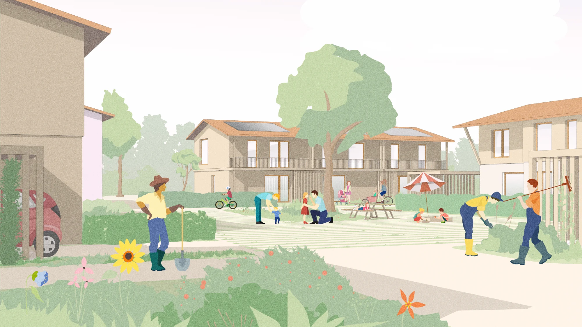 Die Verkehrskonzeption bündelt den motorisierten Verkehr auf wenige, verkehrsberuhigte Straßen und hält die Wohnhöfe weitgehend autofrei. Gemeinsame Carports an den Hofeingängen bündeln Stellplätze und Infrastruktur.